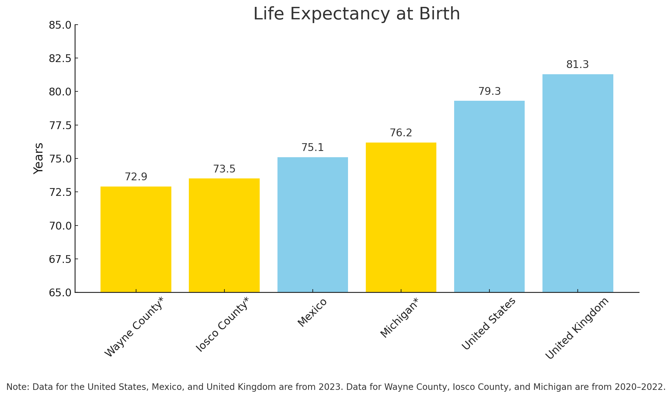 Michigan exhibits all of these problems. Both its urban and rural communities struggle to provide adequate social and human services. The result is far lower life expectancies than should be expected in a free and prosperous nation. Life expectancy in Michigan is a full three years lower than that of the US as a whole. Life expectancy in rural and urban Michigan counties is lower than that of Mexico!