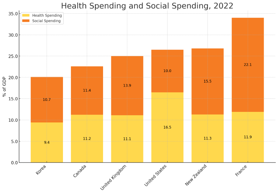 The heart of the problem is a misallocation of societal resources. In her book The American Healthcare Paradox, Elizabeth Bradley showed that the U.S. was comparable to peer nations in combined healthcare and social infrastructure spending. However, the U.S. markedly underspends on social infrastructure and support for families (e.g., addressing food insecurity and homelessness, drug abuse treatment, paid maternal leave, etc.) and, in turn, outspends them in health services.