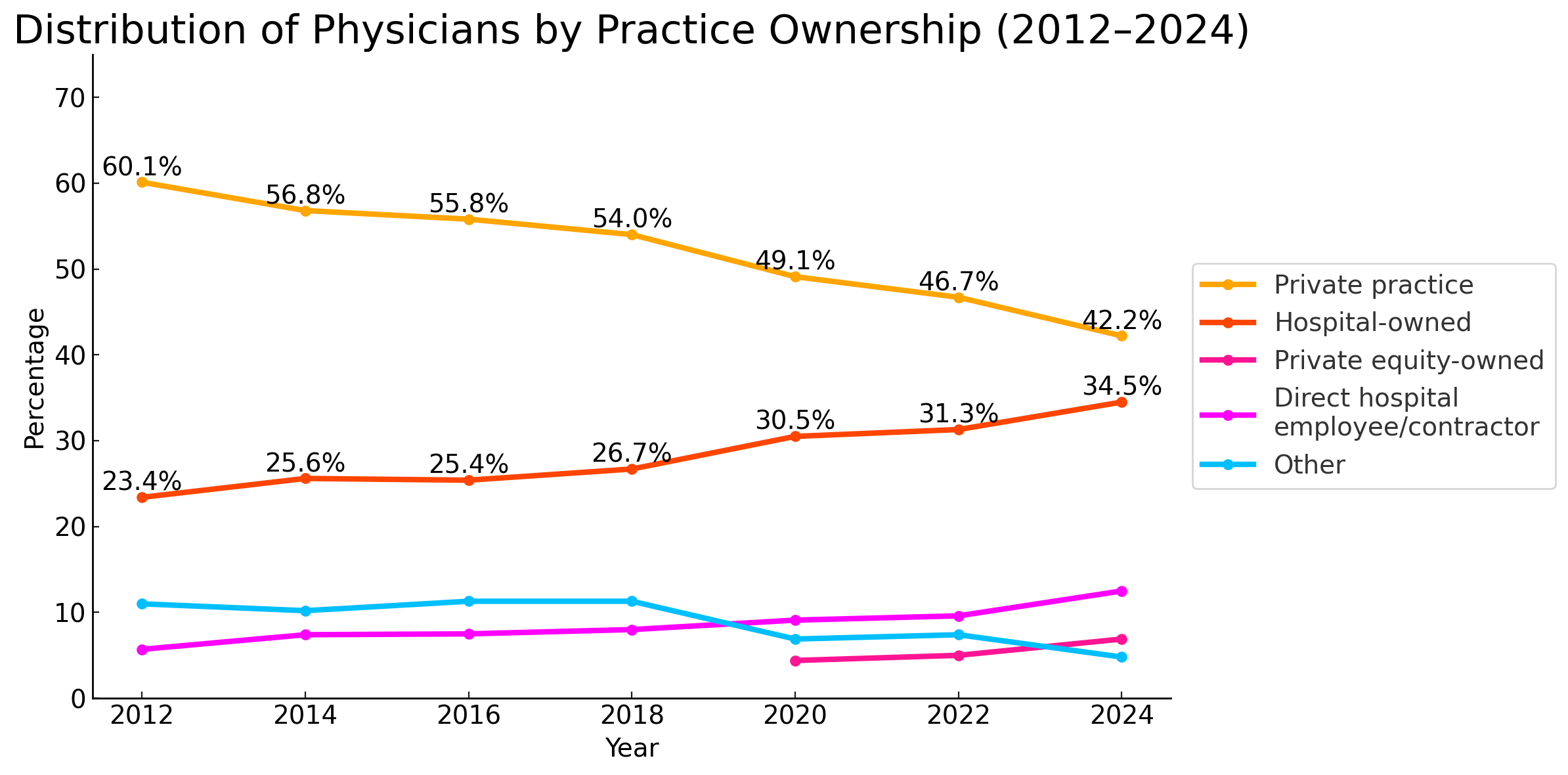 Source: AMA, “Policy Research Perspectives--Physician Practice Characteristics in 2024: Private Practices Account for Less Than Half of Physicians in Most Specialties,” 2025