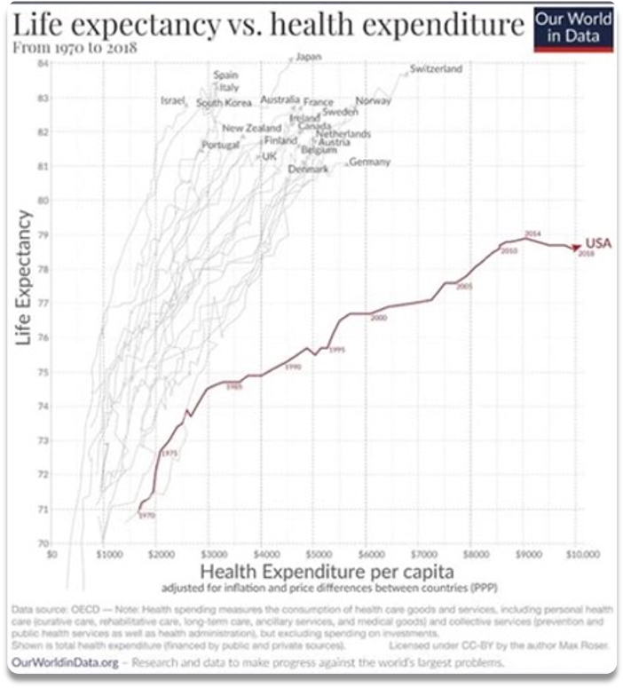 For the past two years, a disturbing graphic about U.S. health spending has been circulating on social media. It shows the United States’ life expectancy and per capita health spending compared to other major countries. The U.S. diverged from the rest of the world in about 1980; life expectancy gains faltered while health costs soared. The point made by this graphic seems to be that health spending in the U.S. has been a terrible investment.